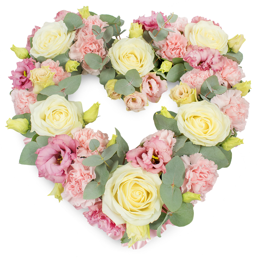 Express your deepest sympathies with our Heartfelt Open Heart Flower Arrangement. This stunning bouquet combines pure white roses, charming pink carnations, delicate pink lisianthus, and lush eucalyptus leaves, offering a unique and beautiful tribute.